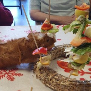 Finalement, c’est un festin de couronnes réalisées avec soin qui va régaler les cochons d’indes, animaux présents ce jour. C’est le temps de l’observation, de l’écoute, des caresses des cochons d’inde qui amusent la galerie avec leurs petits cris, leurs cachettes en mode « tortue » et leurs petites chamailleries pour LE morceau de fruit. C’est le temps également à la parole, on échange sur ce que l’on ressent, si on a déjà eu ces animaux, lequel nous préfèrons, pourquoi,…